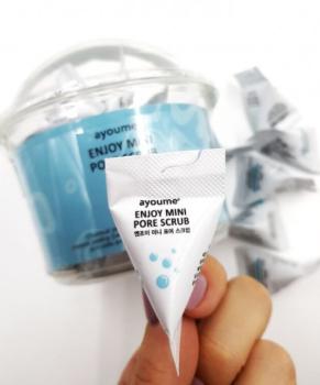 Скраб для очищения пор из серии мини-средств в ярких пирамидках. В индивидуальных саше находится по 3 грамма средства – это очень удобно, экономично и гигиенично. 1 пирамидка рассчитана на 1 применение, все остальные герметично упакованы, что продлевает их срок годности.AYOUME Enjoy Mini Pore Scrub – сочетает функции скраба и пилинга, обеспечивает двойное очищающее воздействие на кожу: физическое (сода) и химическое (AHA, BHA и PHA кислоты).