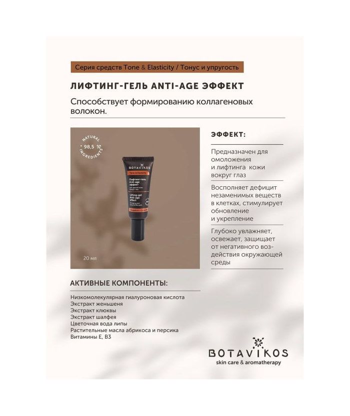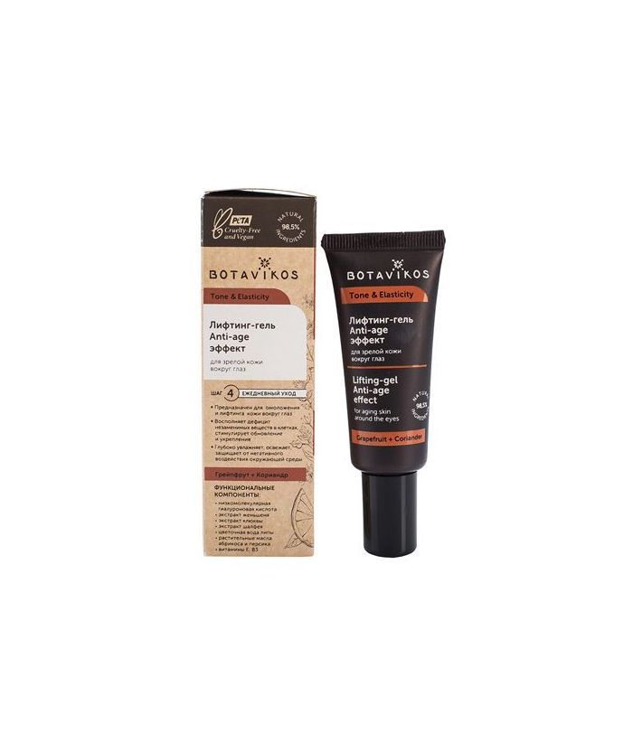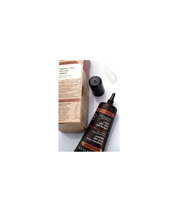 Лифтинг-гель предназначен для ухода за зрелой кожей вокруг глаз. Увлажняет, омолаживает и укрепляет эпидермис, стимулирует обновление клеток и защищает от негативного воздействия окружающей среды. Создан на основе натурального антивозрастного комплекса, гидролата липы, экстрактов женьшеня, клюквы и шалфея, масел абрикоса и персика, витаминов Е и В3. Активные компоненты геля питают, нормализуют обменные процессы, обеспечивают длительный эффект лифтинга, успокаивают кожу, улучшают цвет лица, ускоряют регенерацию клеток и замедляют старение.