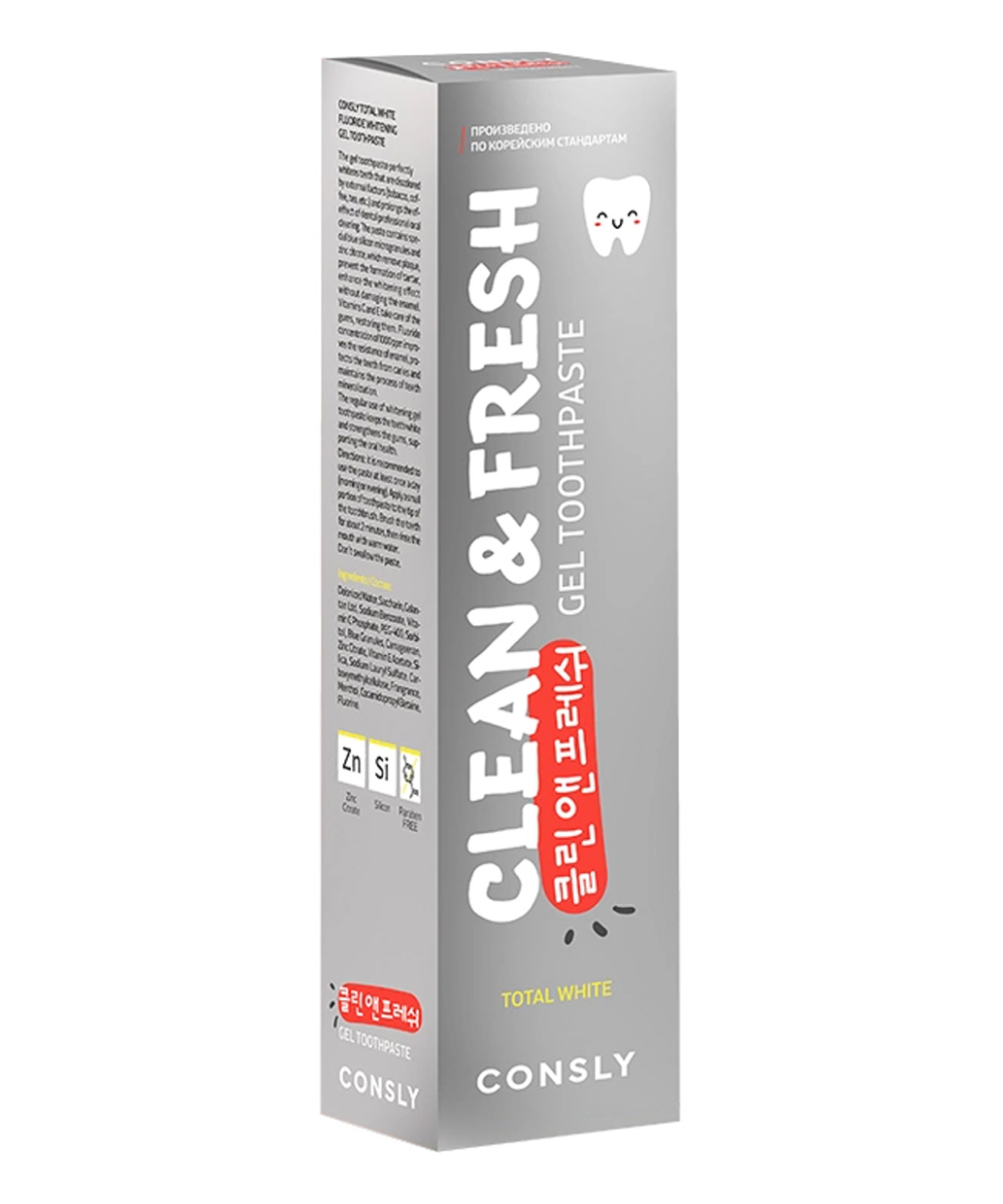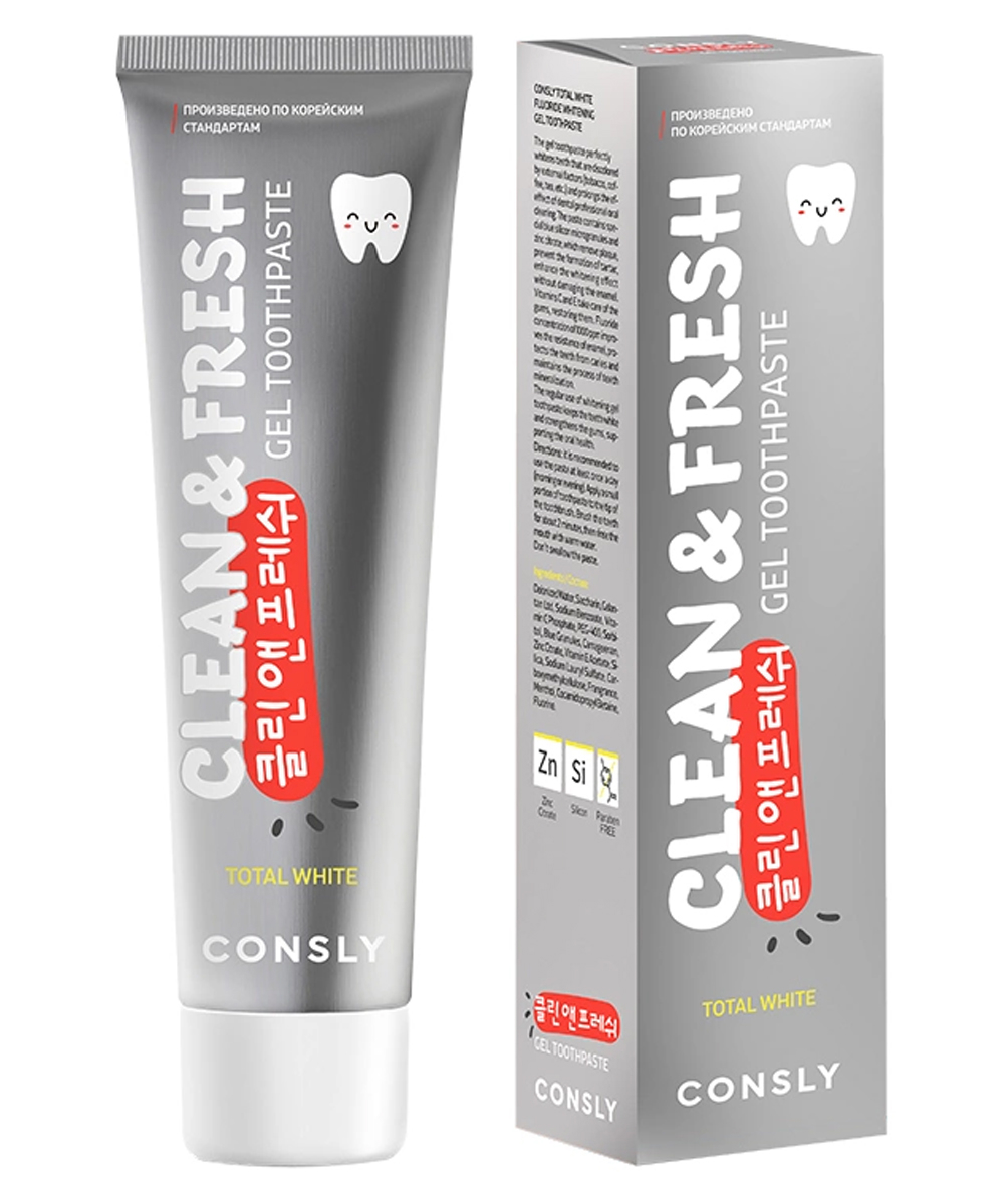 - Гелевая зубная паста Consly содержит специальные синие микрогранулы из кремния, которые эффективно удаляют зубной налет и предотвращают образование зубного камня. Цитрат цинка, входящий в состав пасты, усиливает отбеливающий эффект, делая улыбку ярче и белее. Эти компоненты действуют мягко, не повреждая эмаль, обеспечивая безопасное и эффективное очищение зубов.