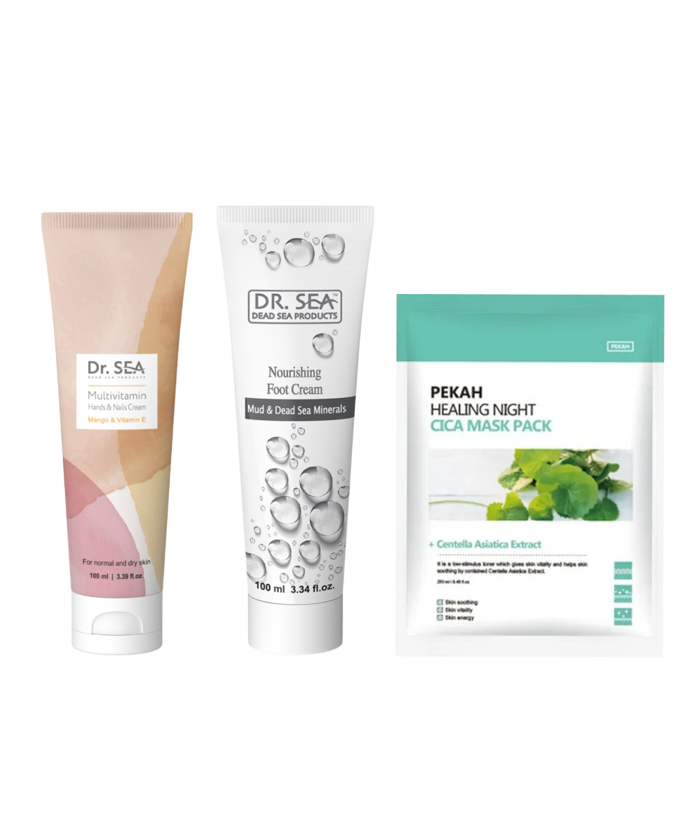 Набор «Зимнее Сияние» (Dr.Sea + PEKAH) сформирован как комплексное решение для поддержки кожи в период повышенной нагрузки, связанной с холодом, сухим воздухом и снижением естественных восстановительных процессов. В составе набора объединены три функционально дополняющих друг друга средства: мультивитаминный крем для рук и ногтей Dr.Sea с манго и витамином E, питательный крем для ног Dr.Sea с грязью и минералами Мертвого моря, а также вечерняя успокаивающая тканевая маска PEKAH с экстрактом центеллы азиатской. Такой подбор позволяет воздействовать на разные зоны и потребности кожи — от восстановления барьерных функций до повышения тонуса и защиты от внешних факторов. Формулы средств основаны на сочетании витаминов, минеральных комплексов, натуральных масел и растительных экстрактов с доказанной дерматологической ценностью. Набор ориентирован на регулярное применение и подходит для разных типов кожи, включая чувствительную. Это универсальный вариант как для личного использования, так и в качестве продуманного подарка с практической пользой.Выбирая наши наборы, вы получаете их в стильной авторской подарочной коробке без дополнительной оплаты — идеальное решение для подарка без лишних хлопот!