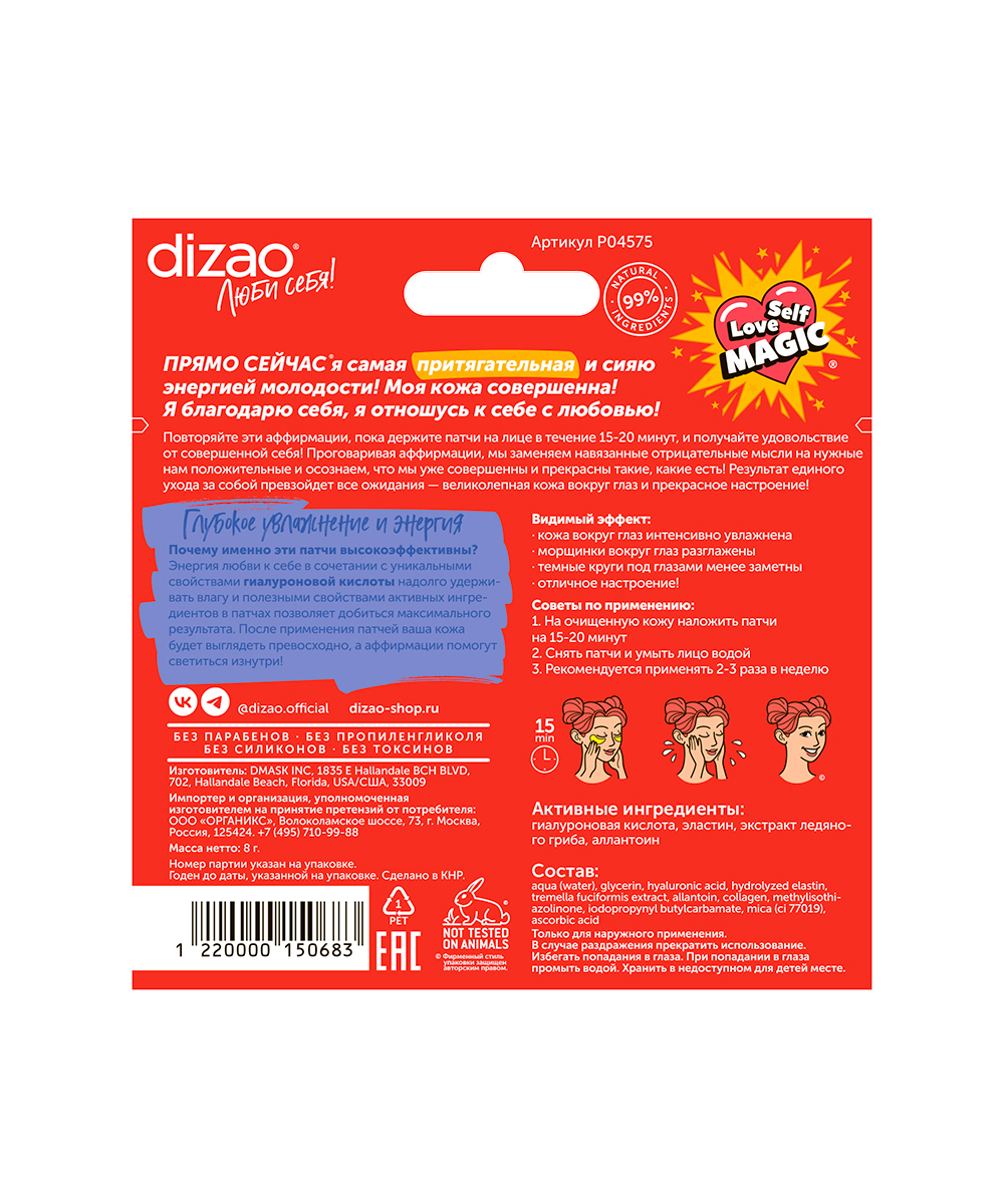 - Главный компонент патчей — гиалуроновая кислота, которая проникает в глубокие слои кожи, обеспечивая длительное и интенсивное увлажнение. Она способна связывать молекулы воды, поддерживая оптимальный уровень влаги в клетках, что критично для предотвращения сухости и появления морщин. Гиалуроновая кислота — это один из самых эффективных ингредиентов, используемых в салонных процедурах, но с патчами DIZAO вы получаете эту пользу в домашних условиях, быстро и доступно.