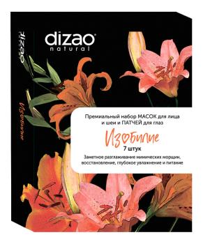 DIZAO Набор ИЗОБИЛИЕ включает 7 масок для лица и шеи, а также гидрогелевые патчи для глаз. Этот бьюти-бокс обеспечивает полноценный уход за кожей: глубокое увлажнение, антивозрастной эффект, питание и сияние. Все продукты созданы на 99% из натуральных компонентов и не содержат парабенов, пропиленгликоля и токсинов.Что входит в набор?
