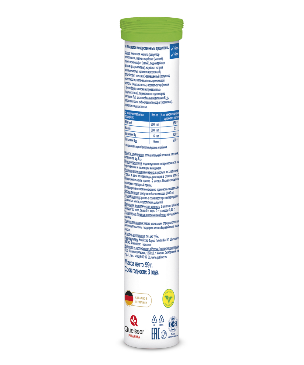 Комплекс рекомендуется как дополнительный источник магния, калия, витаминов В6, В12, компоненты обеспечивают здоровье сердечно-сосудистой и нервной систем, стимулируют обменные процессы организма.Активные компоненты