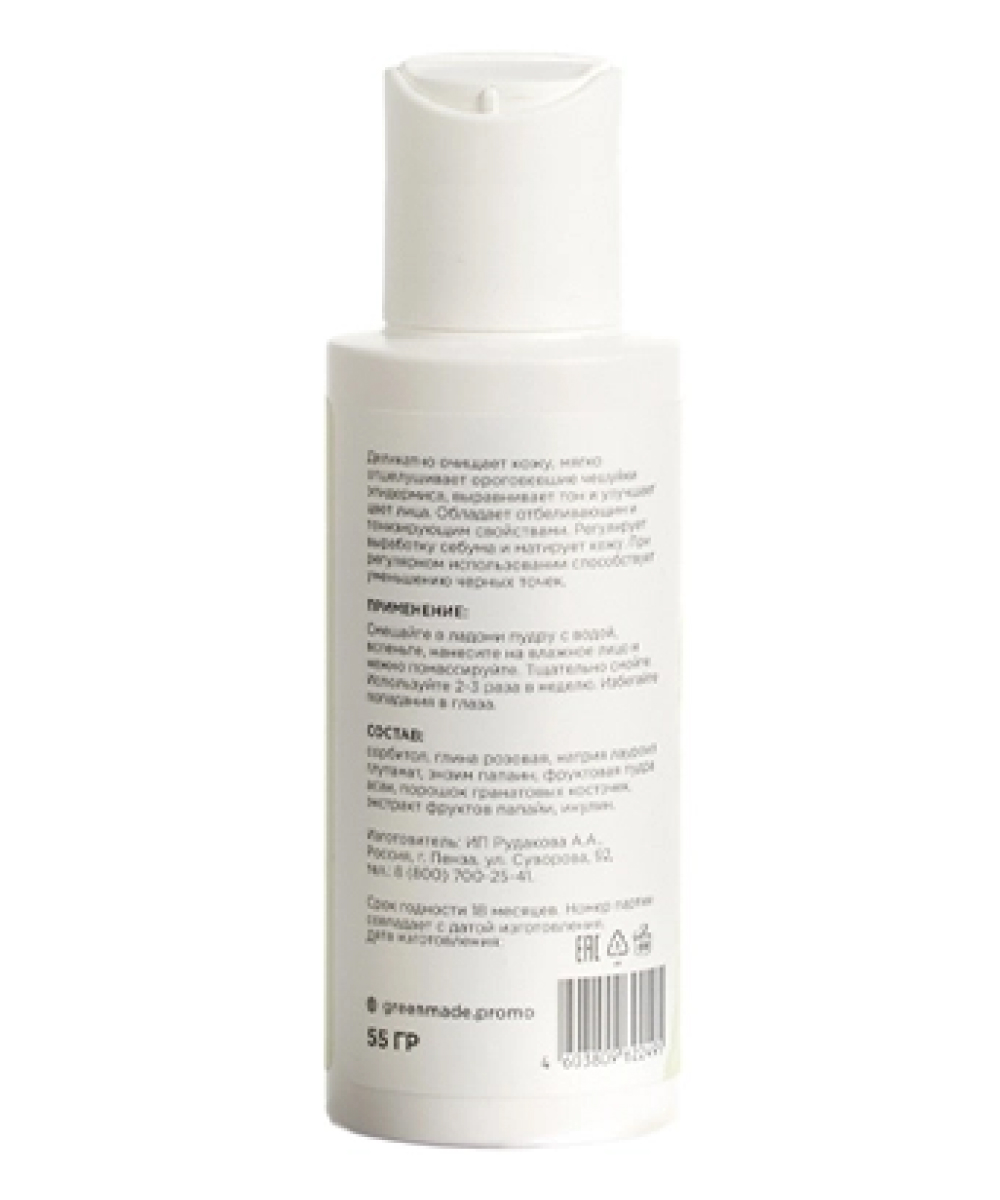 Пудра Greenmade отличается высокой эффективностью и при этом — физиологичностью воздействия. Лёгкое пенящееся средство глубоко очищает кожу, не нарушая её микробиом и не повреждая защитный барьер. Это делает её особенно актуальной при:- расширенных порах и жирности в Т-зоне
