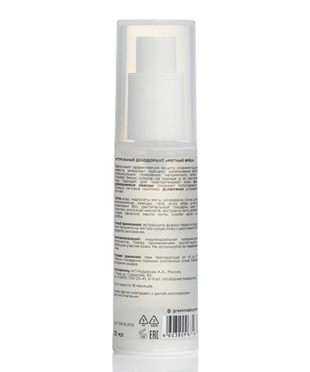 Greenmade MINT FRESH — это сбалансированное сочетание эффективности, деликатного ухода и продуманного состава. Он разработан с учетом потребностей даже очень чувствительной кожи, не содержит агрессивных антиперспирантов и действует мягко, но надежно. Средство подходит для повседневного применения, его можно использовать даже после бритья, не опасаясь жжения или покраснения. Благодаря продуманной текстуре оно быстро впитывается, не оставляя липкости и ощущения пленки. Дезодорант обеспечивает чистоту и свежесть, при этом не нарушая важные физиологические процессы кожи.Результаты применения: