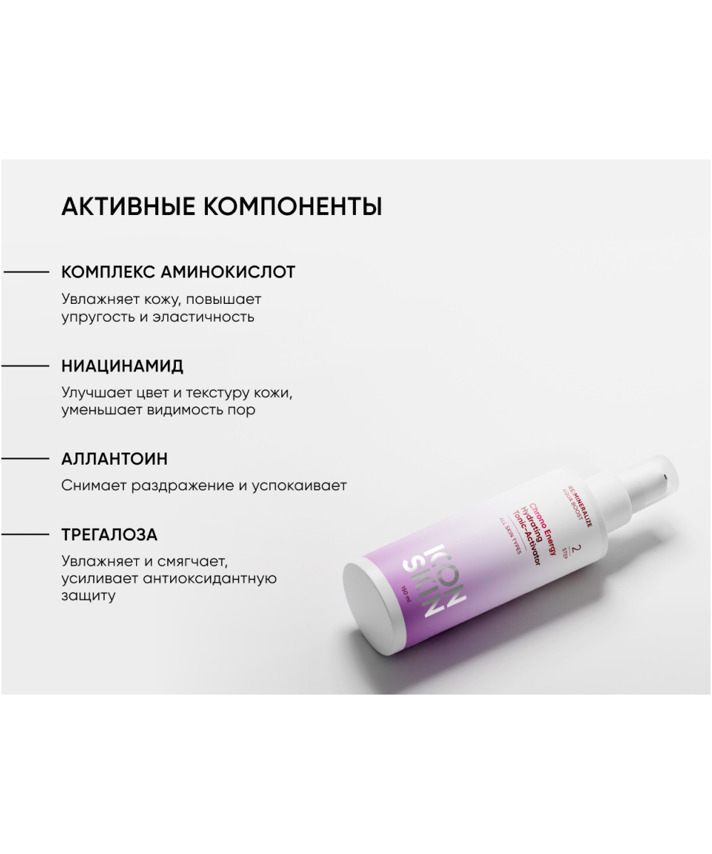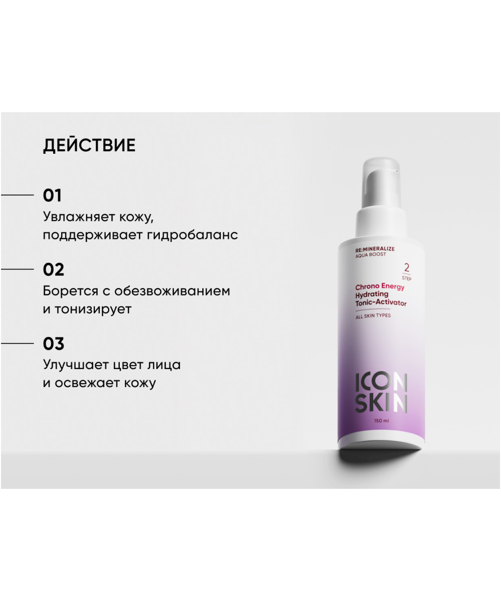 Современная кожа ежедневно подвергается стрессу — от сухого воздуха и перепадов температуры до загрязнений и потери влаги. В таких условиях особенно важно поддерживать её естественный баланс и способность к обновлению. ICON SKIN Тоник-активатор для лица минеральный CHRONO ENERGY Mineral Tonic-Activator разработан как первый и важный этап ухода, направленный на глубокое увлажнение и восстановление энергии кожи. Его формула, обогащённая аминокислотами, ниацинамидом, трегалозой и аллантоином, обеспечивает мгновенное увлажнение, улучшает тонус и подготавливает кожу к последующим этапам ухода. Это не просто тоник, а полноценный активатор, который помогает коже дышать, восстанавливаться и выглядеть свежей каждый день.Преимущества