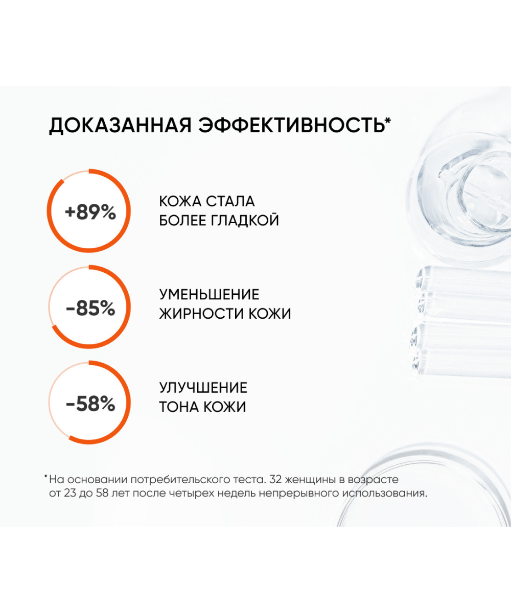 - Доказанная эффективность*: 88% женщин отметили улучшение гладкости кожи, 85% — снижение жирности, 58% — выравнивание тона.