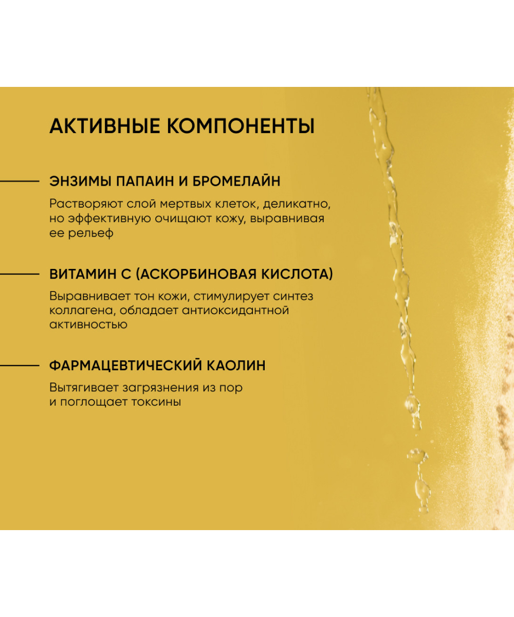 - Энзимы папаин и бромелаин — растворяют мертвые клетки кожи, стимулируют регенерацию и улучшают биодоступность последующего ухода.