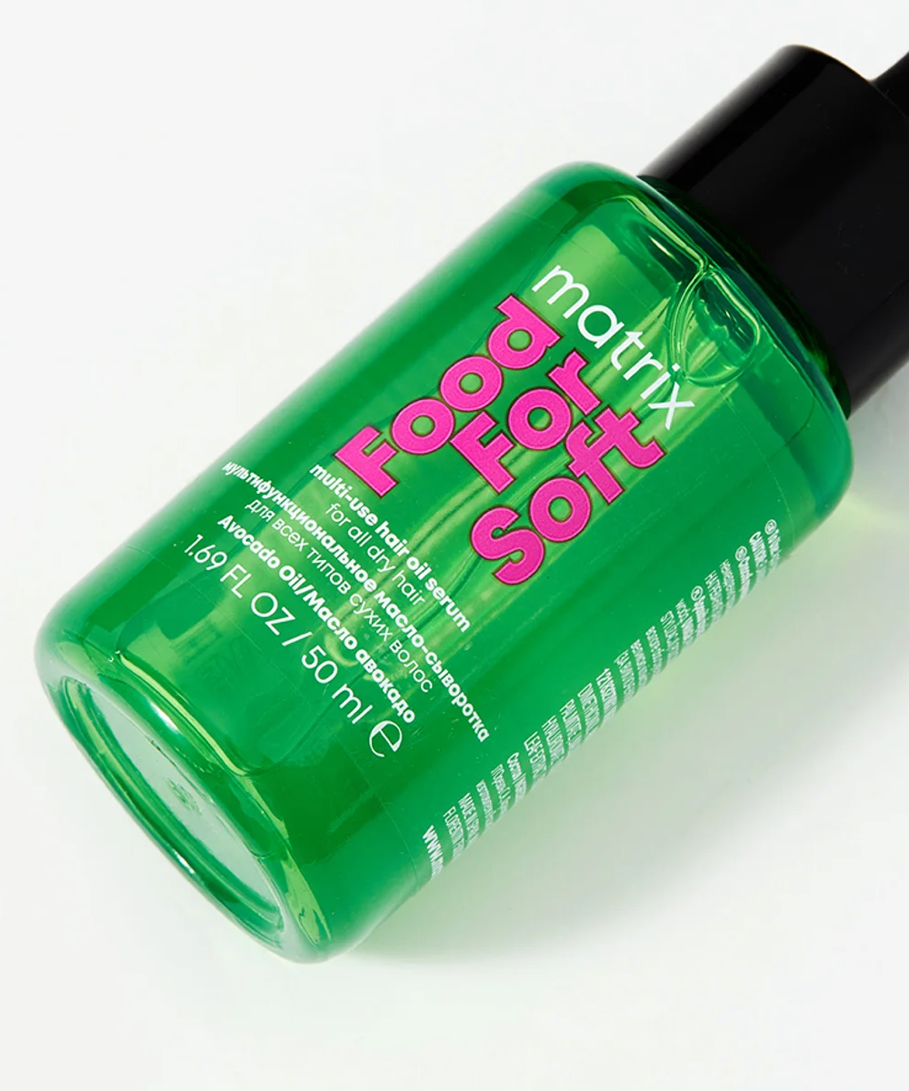 Многофункциональное масло-сыворотка Food For Soft для всех типов сухих волос с маслом авокадо. Этот несмывайемый уход помогает запечатывать влагу в волосах, сделать волосы блестящими, гладкими, визуально уменьшить секущиеся кончики. Обеспечивает термозащиту до 230 °С. Масло делает волосы заметно более мягкими на 72 часа. Аромат раскрывается сладкими нотами ириски, жасмина, фрезии и ванили.