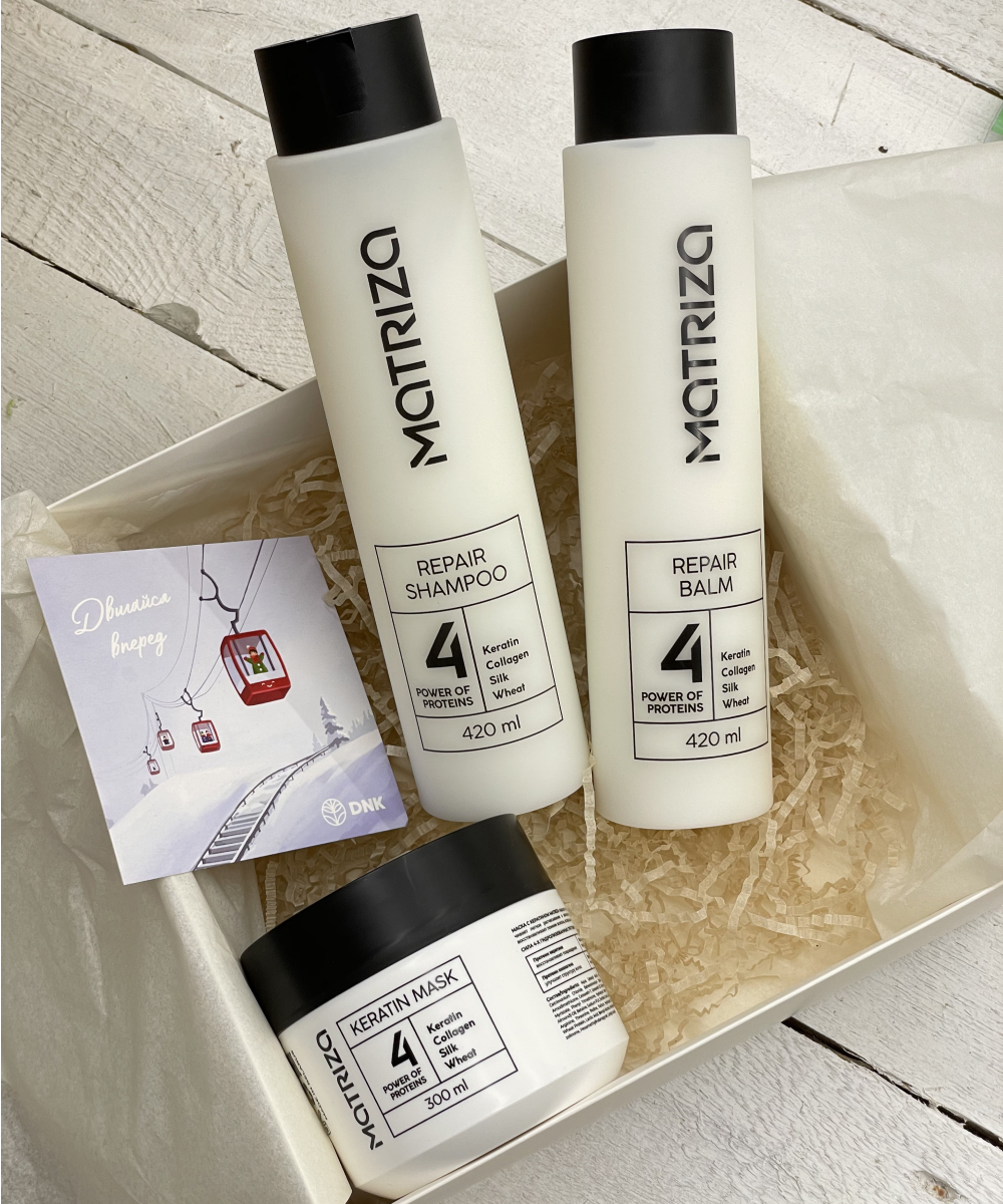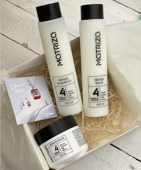 Набор Matriza REPAIR эффективен для системного ухода за ломкими, ослабленными и повреждёнными волосами, структура которых нарушена в результате окрашивания, термического воздействия или механических нагрузок. Такие волосы теряют эластичность, становятся более пористыми и склонными к ломкости, поэтому требуют комплексного восстановления на всех этапах ухода. Формулы шампуня, бальзама и маски выстроены по принципу поэтапного воздействия: мягкое очищение, восстановление и укрепление, а также глубокое структурное питание. Средства в наборе работают синергично, усиливая действие друг друга и обеспечивая устойчивый результат при регулярном применении. Основу формул составляет комплекс протеинов, близких по структуре к природным компонентам волоса. Благодаря этому уход направлен не только на визуальное улучшение, но и на восстановление внутренней целостности волосяного стержня.Выбирая наши наборы, вы получаете их в стильной авторской подарочной коробке без дополнительной оплаты — идеальное решение для подарка без лишних хлопот!