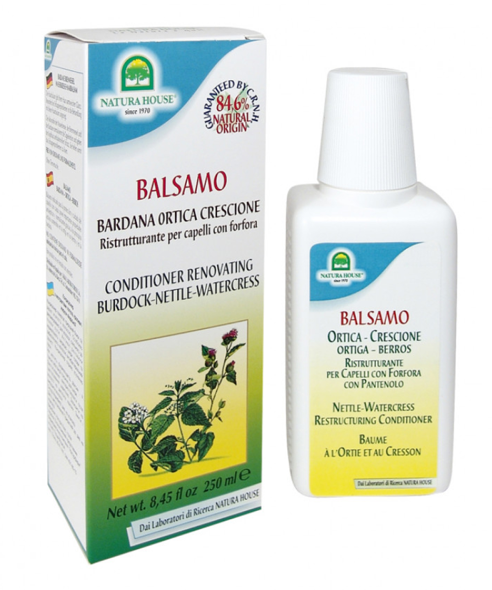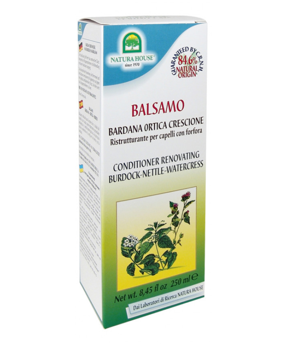 Natura House Conditioner Renovating Burdock - Nettle - Watercress — кондиционер для волос, созданный для восстановления структуры волос и улучшения состояния кожи головы. Его формула состоит из природных компонентов и обогащена экстрактами лопуха, крапивы и жерухи лекарственной, а также пшеничным протеином и провитамином B5. Кондиционер помогает нормализовать секрецию сальных желез, укрепляет корни волос и придает локонам здоровый блеск. Он мягко ухаживает за волосами, облегчает расчесывание и обеспечивает антибактериальную защиту, что особенно важно для волос с перхотью.Преимущества