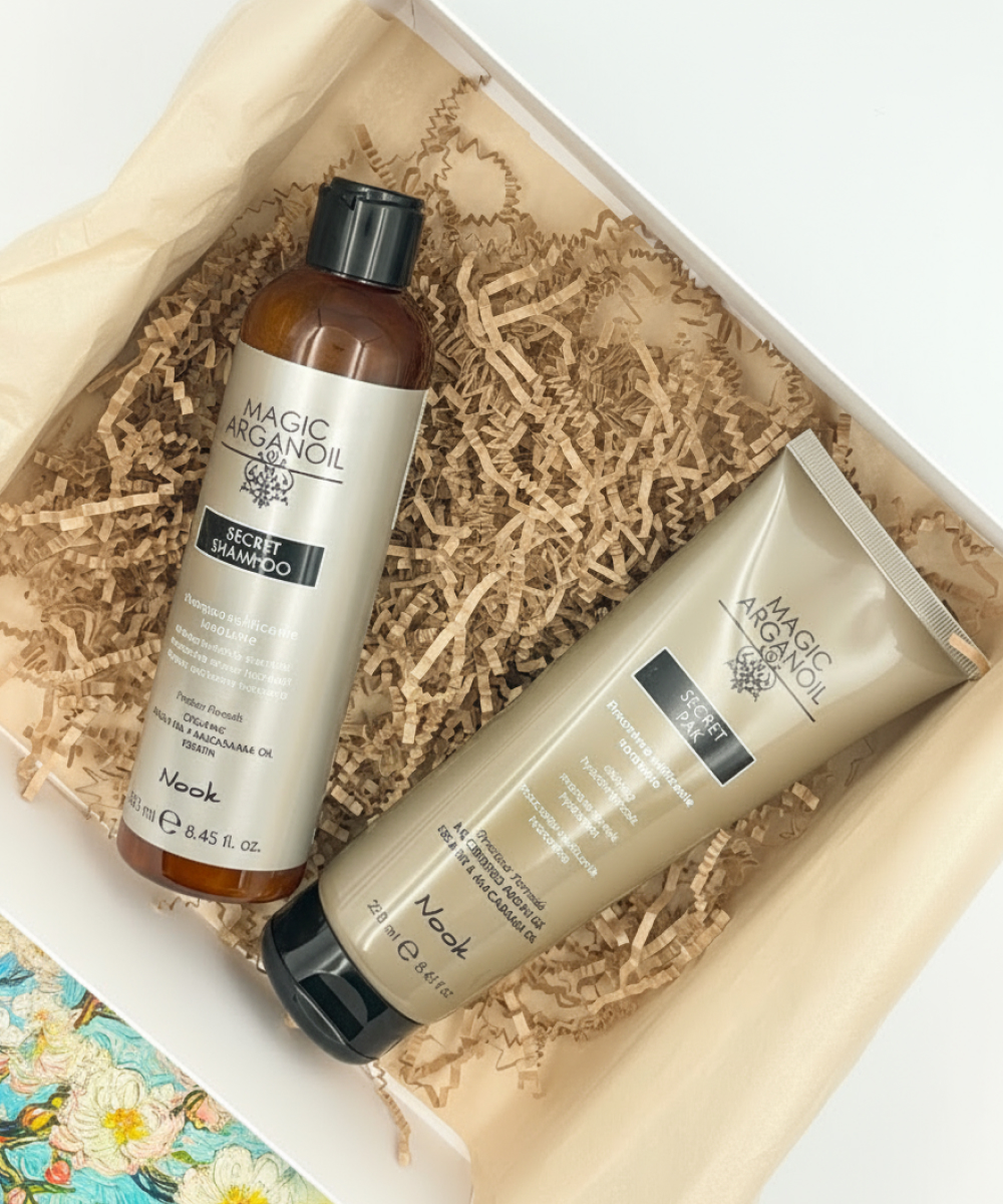 - В основе формулы набора NOOK Magic Arganoil лежат три ключевых ингредиента, которые обеспечивают заметный результат уже после первых применений. Аргановое масло действует как мощный источник антиоксидантов и витамина Е: оно глубоко питает, восстанавливает поврежденные участки волос и защищает их от пересыхания. Масло макадамии богато жирными кислотами, которые смягчают волосы, делают их послушными, предотвращают ломкость и возвращают эластичность. Гидролизованный кератин укрепляет структуру волоса изнутри, заполняя поврежденные зоны и удерживая влагу. В результате волосы становятся плотнее, сильнее и заметно более гладкими.