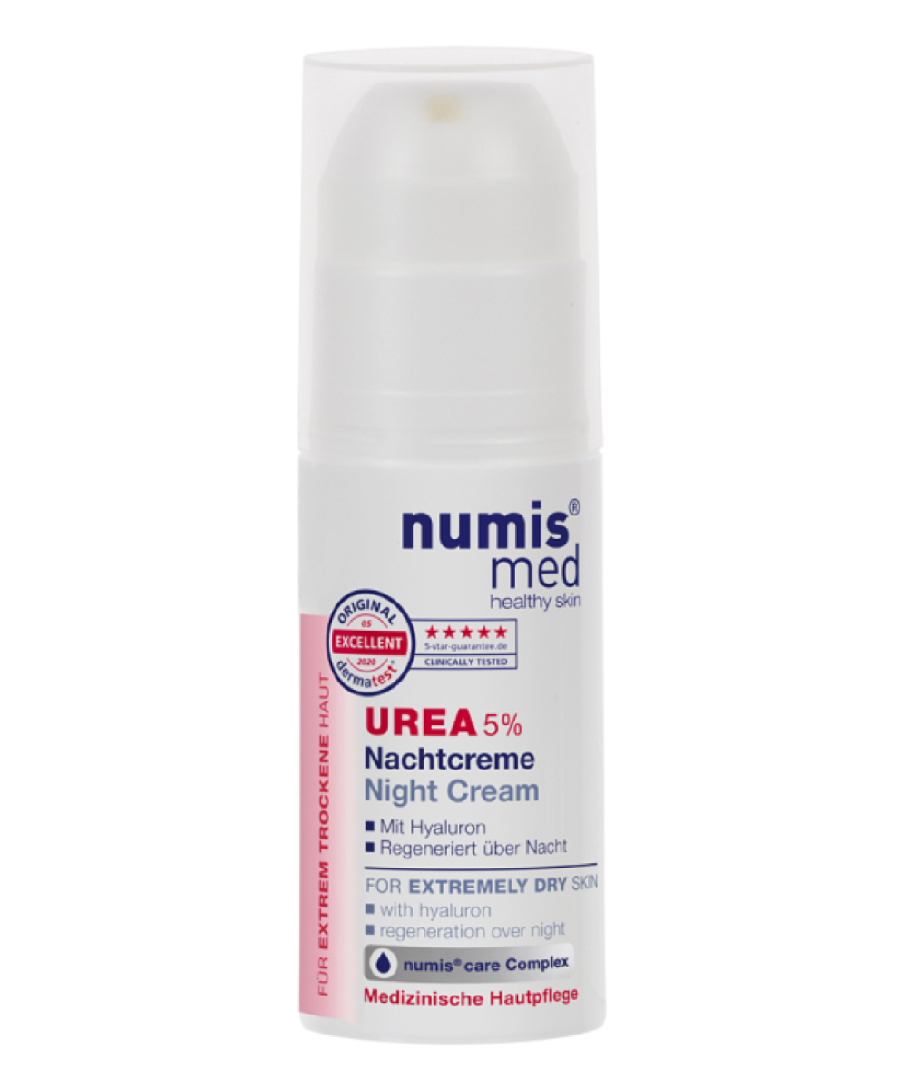 Numis med Ночной крем для лица с 5% мочевиной и гиалуроновой кислотой разработан для ухода за очень сухой и чувствительной кожей. Его высокоэффективная формула обеспечивает интенсивное и длительное увлажнение, способствует регенерации кожи в течение ночи, снижает стянутость и предупреждает появление первых признаков старения. Комплекс numis® care совместно с гиалуроновой кислотой восстанавливает барьерные функции кожи, делая её гладкой, эластичной и более комфортной утром.Преимущества