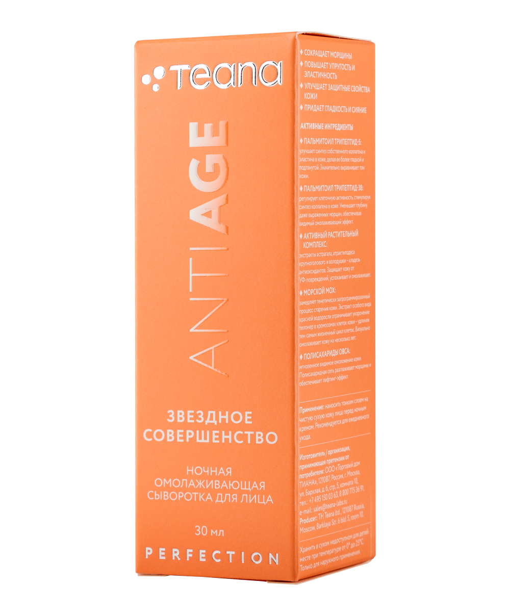 Ночная сыворотка Teana «Звездное совершенство» представляет собой высокотехнологичное средство антивозрастного ухода, разработанное с учетом физиологических процессов, происходящих в коже во время сна. В этот период активизируются механизмы восстановления, и клетки наиболее восприимчивы к действию биологически активных веществ. Формула сыворотки направлена на глубокую реконструкцию дермального матрикса, стимуляцию синтеза коллагена и эластина, восстановление барьерных функций и замедление процессов клеточного старения.Благодаря сочетанию пептидов нового поколения, морских полисахаридов и растительных экстрактов с доказанным антиоксидантным потенциалом, средство обеспечивает комплексное воздействие на все основные признаки возрастных изменений. При регулярном применении повышается плотность и эластичность кожи, сокращается выраженность морщин, улучшается микроциркуляция и внешний вид лица приобретает ровный, здоровый тон.
